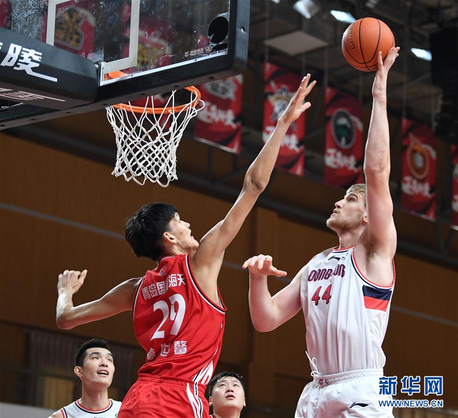 10月20日,时代中国广州队球员哈斯(上右)在比赛中上篮。 当日,在浙江诸暨举行的2020-2021赛季中国男子篮球职业联赛(CBA)第一阶段第二轮比赛中,青岛国信海天队以112比88战胜时代中国广州队。 新华社记者沙达提摄