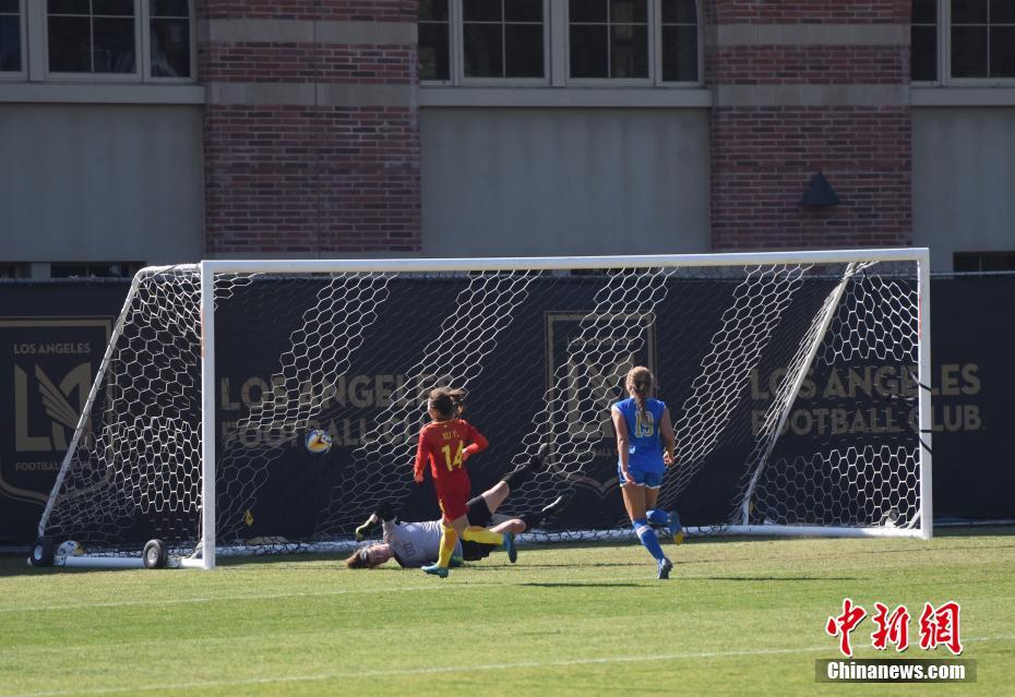 当地时间2月9日上午,正在美国洛杉矶冬训的中国国家女子足球队对战2017年全美女足大学联赛亚军加州大学洛杉矶分校女足。这是中国女足此次海外拉练的第三场比赛,中国队以4比0取胜。图为中国队进球瞬间。中新社记者 张朔 摄