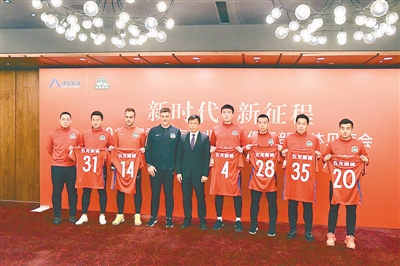 主教练塔拉吉奇(左四)、总经理郭光琪(中)带领新援亮相见面会