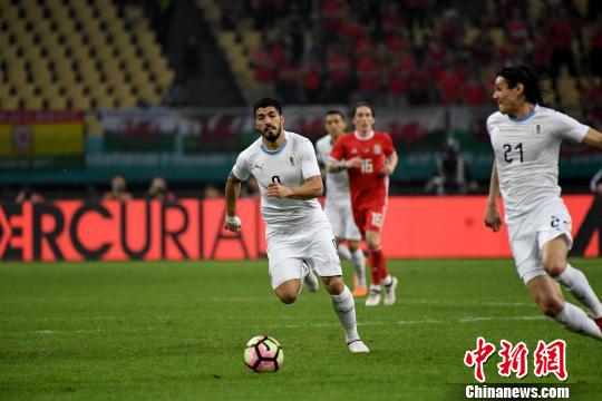 图为乌拉圭队球员苏亚雷斯(白衣9号)在比赛中。 俞靖 摄