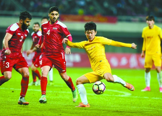 3月27日晚,中国足协U21选拔队国际足球友谊赛第三场对阵叙利亚U23队的比赛在长沙贺龙体育中心进行,中国队以0比1落败。图为中国U21选拔队队员(右)在比赛中射门。