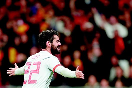 湖北日报讯 图为:3月28日凌晨,西班牙队球员伊斯科庆祝上演“帽子戏法”。(新华社发)