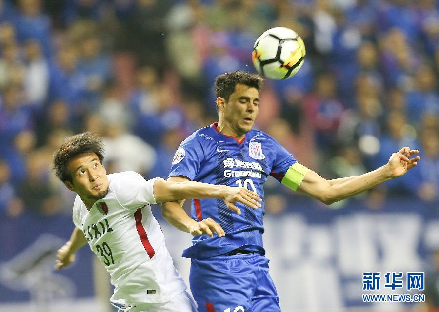 ↑4月3日,上海绿地申花队球员莫雷诺(右)和鹿岛鹿角队球员犬饲智也在比赛中争顶头球。当日,在2018年亚冠联赛小组赛H组第五轮比赛中,中超上海绿地申花队主场以2比2战平日本鹿岛鹿角队。 新华社记者丁汀摄