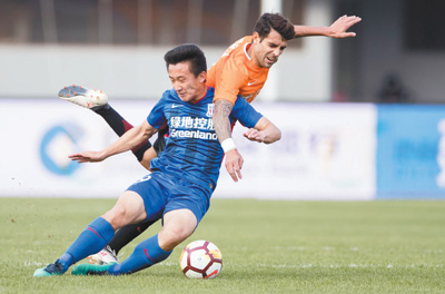 4月8日,北京人和队球员费尔南德斯(后)与上海申花队球员丛震在比赛中拼抢。