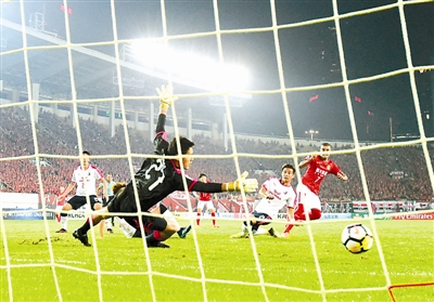 4月17日,广州恒大队球员阿兰(右一)在比赛中射门得分。