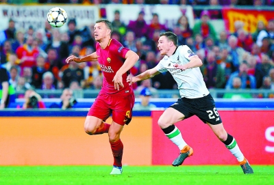 罗马队球员哲科(左)与利物浦队球员罗伯特森拼抢。 新华社发