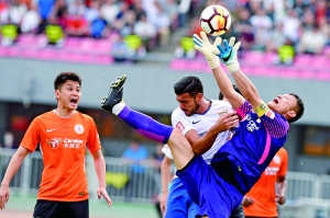 北京人和队守门员张烈在比赛中化解险情。新华社发