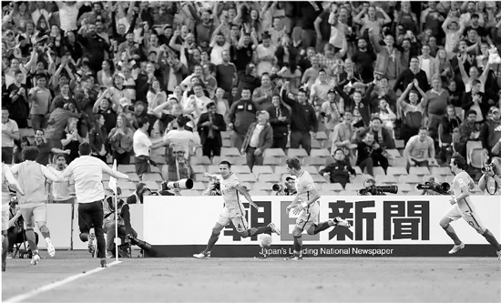 澳大利亚队球员卡希尔(右三)在比赛中庆祝进球。