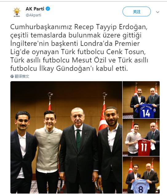 球星们向埃尔多安赠送了签名球衣,并合影留念。德籍土裔球员京多安还在球衣上写着“诚挚致敬我的总统”。随后,埃尔多安所在政党正义与发展党(AKP)将这些照片发布到了社交网站推特上。