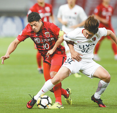 5月16日,上海上港队球员胡尔克(左)在比赛中拼抢。