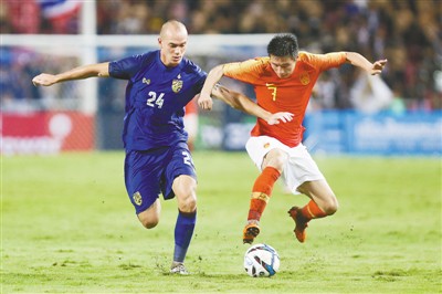 此番面对泰国队,中国男足主教练里皮只对上一场对阵缅甸队的首发阵容稍作调整,意在进一步强化球员间的默契,不过在雨势尚不算大的上半场,其效果并不理想。与泰国队相比,中国队在组织进攻时难以打出流畅的配合,锋线三人组武磊、肖智和黄紫昌之间缺少联系呼应,本场进入首发阵容的朴成则尚未完全找到队友的节拍。可以看出,在第100次代表国家队出战的郑智带领下,中国男足队员都在努力加强相互间的配合,不过终究还是因欠缺默契而失误频频,难以制造真正的威胁。