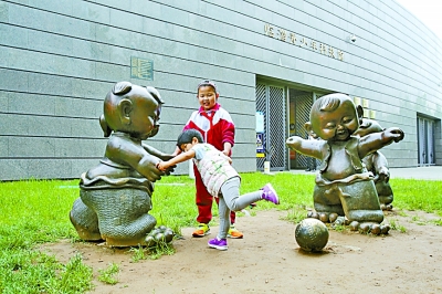 和蹴鞠娃雕塑互动的孩子们。本报记者 闫汇芳摄/光明图片