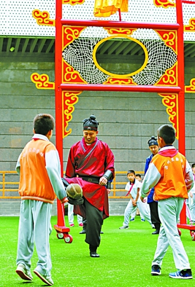 在临淄,这样的蹴鞠活动随处可见。蹴鞠小镇的一块五人制足球场上,十多个孩子奔跑在平坦的人造草坪上,挥洒着汗水,享受着足球运动带来的欢乐。