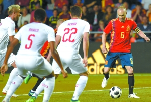西班牙队球员伊涅斯塔(右)在比赛中控球。 新华社/法新