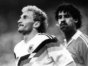上世纪80年代末,“三剑客”率队在1988年欧锦赛夺冠,荷兰足球的复兴迈入巅峰。但仅仅两年后的世界杯,他们却在小组赛收获了三连平,靠抽签进了淘汰赛。面对死敌联邦德国队,“橙衣军团”一扫小组赛的低迷,场面上取得了压倒性优势。里杰卡尔德状态尤其神勇,在他的看守下,德国两名前锋沃勒尔和克林斯曼毫无机会。然而,戏剧性的一幕发生了,荷兰铁卫向沃勒尔吐口水被镜头清晰捕捉到,两人双双被罚下。缺少后防中坚的荷兰队最终1比2遭淘汰。让里杰卡尔德愤怒失态的原因是他遭到了沃勒尔的谩骂。多年后,前者仍表态终生不会原谅德国前锋。