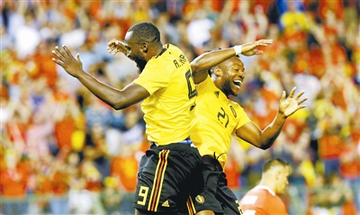 6月11日,比利时队球员巴舒亚伊(右)在进球后和队友卢卡库庆祝。当日,在布鲁塞尔进行的一场国际足球友谊赛中,比利时队以4比1战胜哥斯达黎加队。 新华社/路透