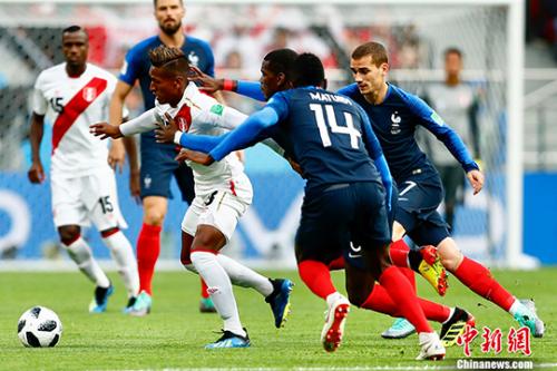中新网6月22日电 10.8亿欧元的身价和夺冠热门的头衔,法国队用胜利为自己正名。一球小胜秘鲁过后,两战两胜的法国队率先晋级16强,而两战皆负的秘鲁队成为第四支提前无缘世界杯淘汰赛的球队。