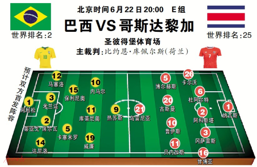 纵然首轮被瑞士队逼平,导致次轮赢球压力增大,不过,巴西队与哥斯达尼加队历史交锋战绩是9胜0平1负,在世界杯决赛圈更是全胜,北美球队实力偏弱,桑巴军团赢球是硬道理,何况内马尔已经恢复训练。