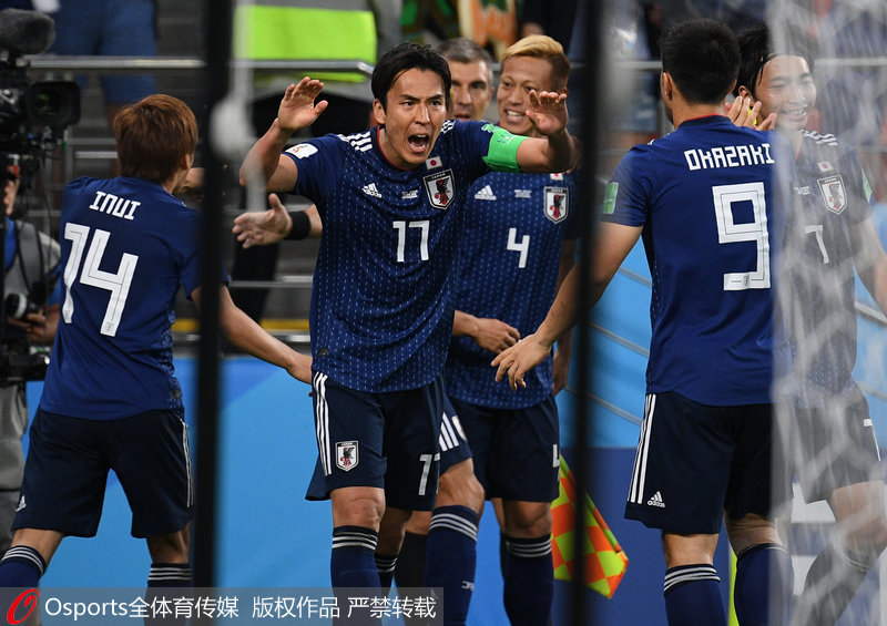 日本首发:1-川岛永嗣、5-长友佑都、3-昌子源、22-吉田麻也、19-酒井宏树、17-长谷部诚、7-柴崎岳、14-乾贵士、10-香川真司、8-原口元气、15-大迫勇也;