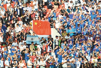 6月16日,中国球迷在莫斯科世界杯赛场观看比赛。