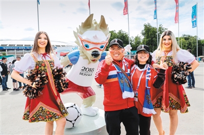 6月14日,来自中国江西的球迷熊培相(中)与妻子在世界杯吉祥物前合影。