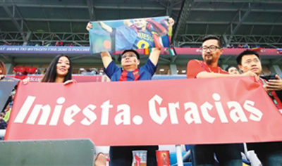 6月25日,几名支持西班牙队伊涅斯塔的中国球迷在开赛前造势。