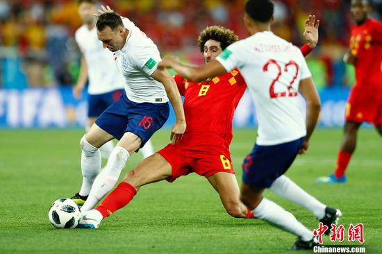 俄罗斯世界杯G组,比利时1:0战胜英格兰。图为双方争抢足球。中新社记者 富田 摄