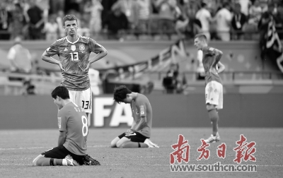 激动跪地的韩国队和失落的德国队。新华社发