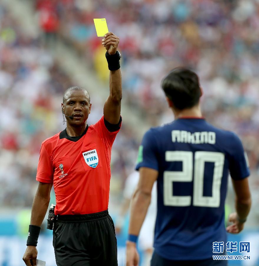 ↑主裁判在比赛中向日本队球员槙野智章出示黄牌。新华社记者 杨磊 摄