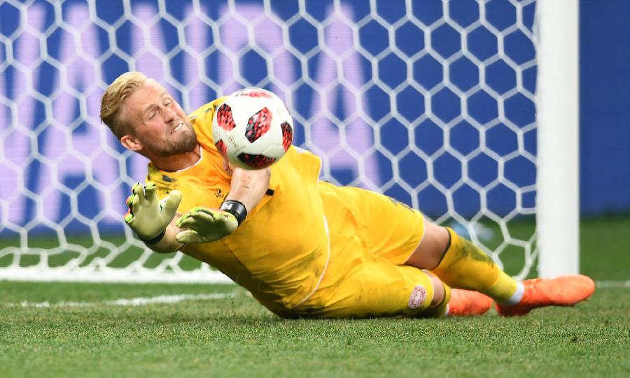 7月1日丹麦VS克罗地亚,丹麦队门将舒梅切尔扑出克罗地亚队球员皮瓦里奇的点球。新华社记者杜宇摄