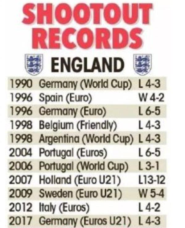 英格兰都赢点球了,你还有什么理由不努力?之前,点球,对于英格兰球迷来说简直就等于两个字:噩梦。 1990年来,他们七次在世界杯和欧洲杯大赛中遭遇点球大战,只在1996年欧洲杯四分之一决赛赢下了一次。
