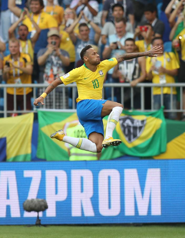 7月2日巴西队对阵墨西哥队,巴西队球员内马尔在比赛中庆祝进球。新华社记者鲁金博摄