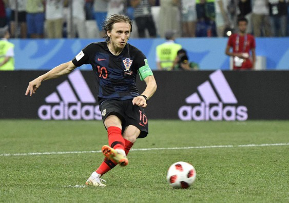 7月1日克罗地亚迎战丹麦,克罗地亚队球员莫德里奇在点球大战中罚入点球。新华社记者贺灿铃摄