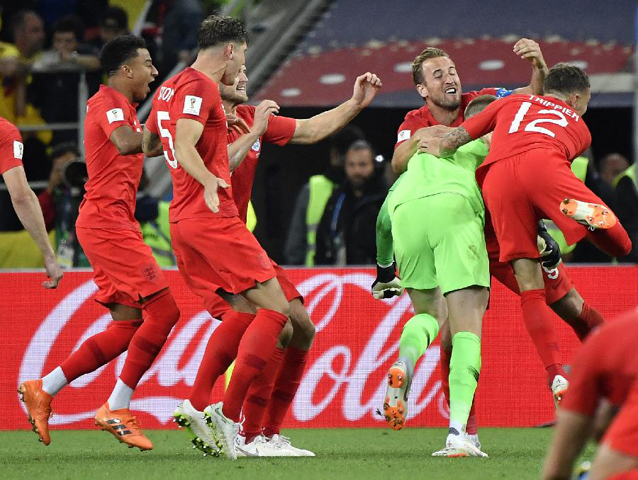 7月3日,英格兰队球员在与哥伦比亚队比赛后庆祝胜利。新华社记者贺灿铃摄
