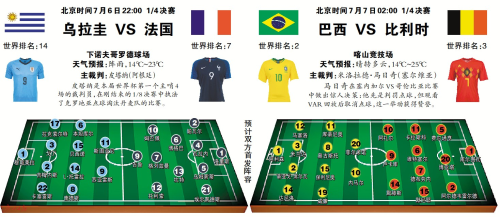 乌拉圭队和法国队在本届世界杯上均保持不败。前者4连胜,还淘汰了欧冠冠军葡萄牙队,他们的防守让C罗毫无用武之地。而后者淘汰了梅西领衔的阿根廷队,信心大增。两强相遇,法国队在世界杯上对阵南美球队已连续9场不败,而乌拉圭队历史上6次晋级世界杯8强,只有一次无缘半决赛。