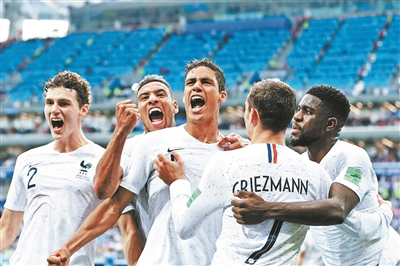 法国队攻击点多得让人羡慕,瓦拉内(中)和帕瓦尔(左一)这样的后防大将都能进球