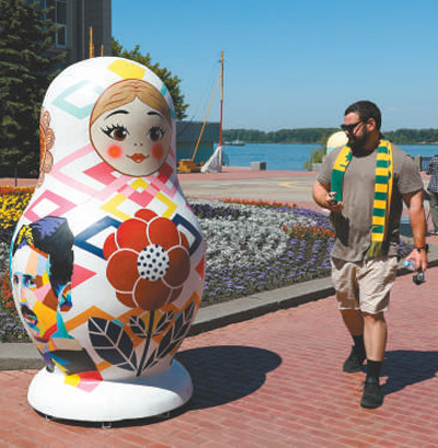 一名球迷经过俄罗斯萨马拉市广场上摆放的巨型“世界杯”套娃。 人民视觉