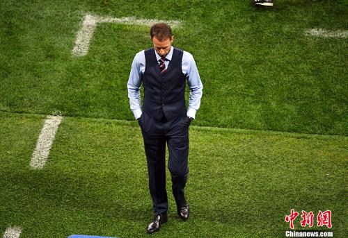 英格兰主帅索斯盖特独自走下赛场,神情落寞。中新社记者 毛建军 摄
