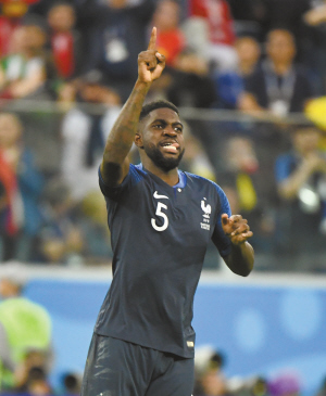 图为法国队球员乌姆蒂蒂在比赛中庆祝进球。