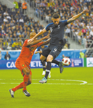 图为比利时队球员孔帕尼(左)与法国队球员吉鲁在比赛中拼抢。