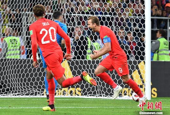 图为英格兰队球员哈里-凯恩庆祝进球。中新社记者 毛建军 摄