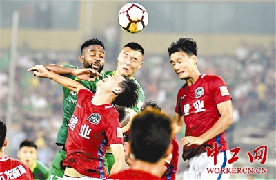 7月18日晚,2018赛季中超联赛第12轮赛比赛,北京中赫国安主场2比1战胜河南建业,国安积分提升到25分,升至积分榜首位。图为双方球员在门前争抢头球。