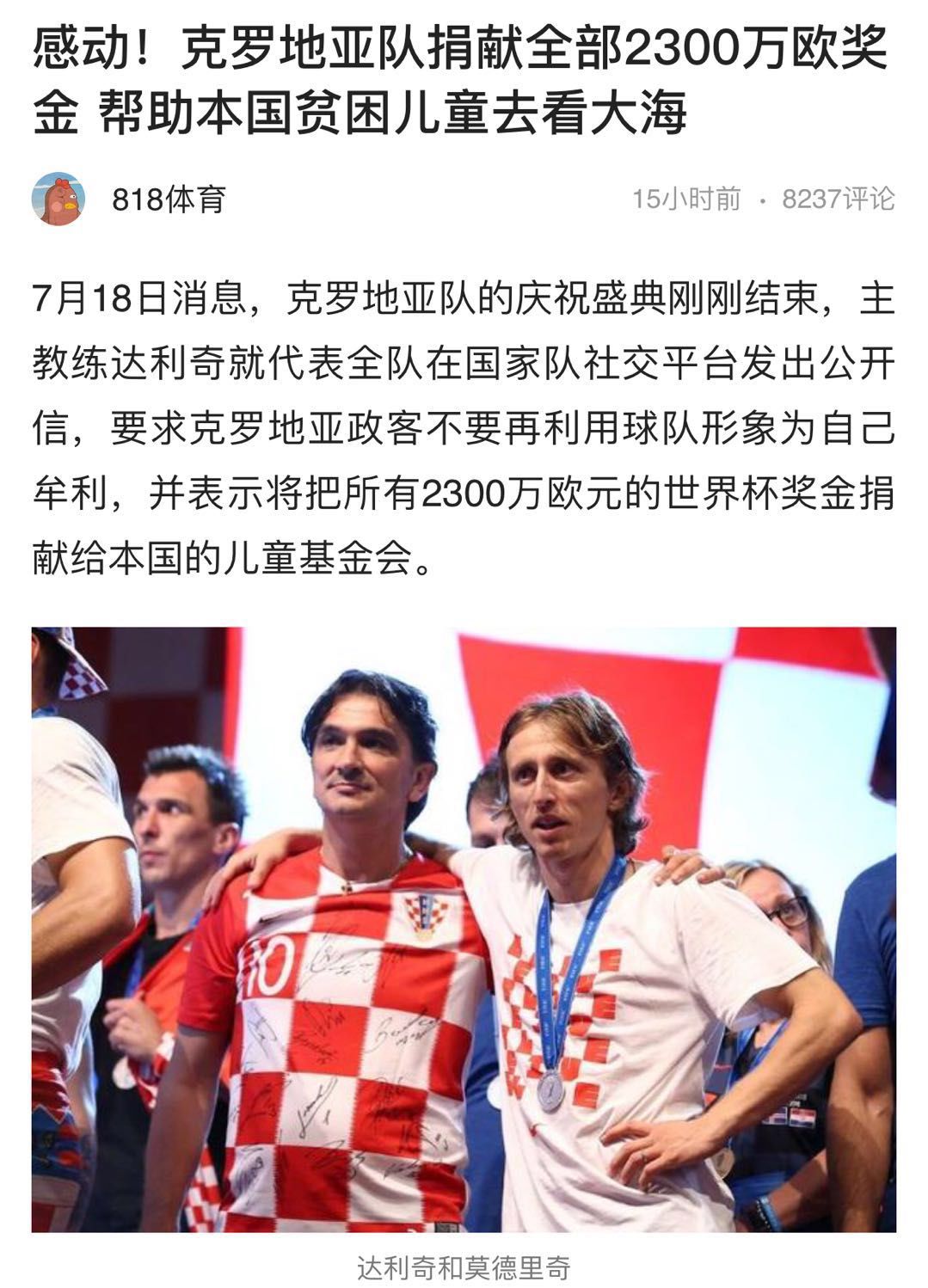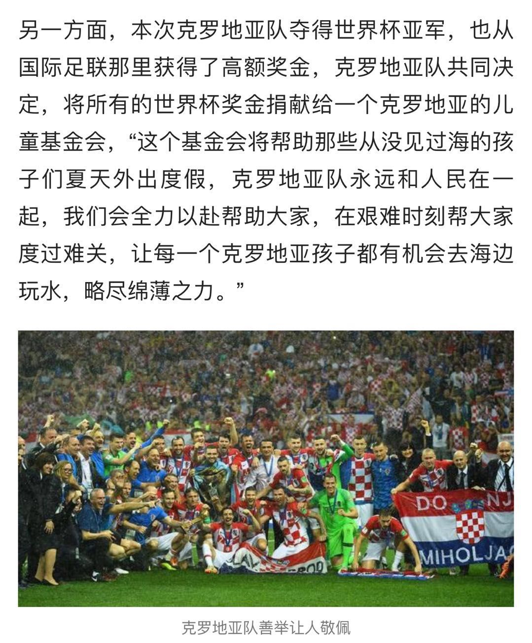 “克罗地亚队将捐献全部奖金2300万欧,帮助本国贫困儿童去看大海”。↓