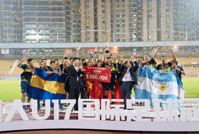图为4月份举行的首届恒大杯国际足球冠军赛颁奖现场。资料图片