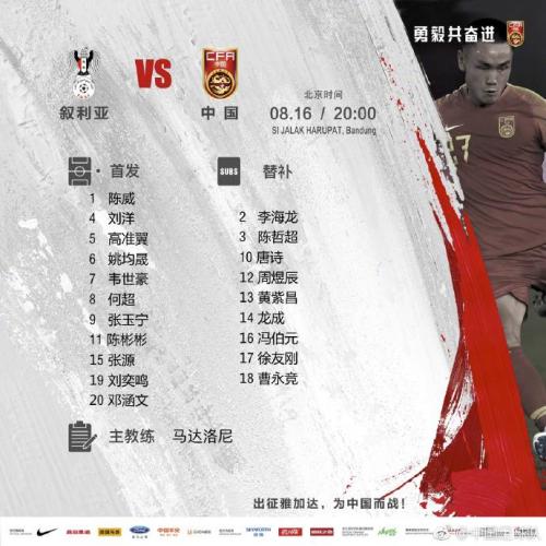 中新网8月16日 北京时间今晚8:00,U23国足将迎战亚运会小组第二个对手叙利亚队。目前,球队本场比赛的首发已经公布,主帅马达洛尼排出了与首战大胜东帝汶完全一致的阵容。