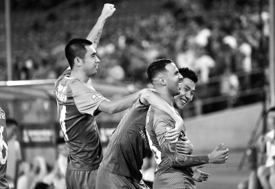 昨晚,足协杯半决赛首回合,国安主场大胜广州富力。梅开二度的比埃拉与队友一起庆祝。 本报记者 和冠欣摄