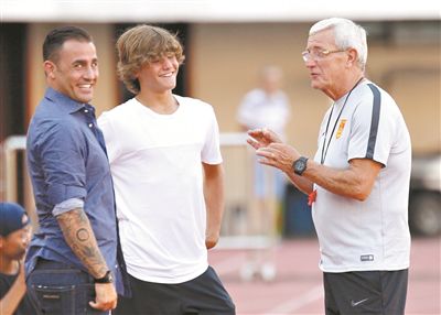 北京时间今天凌晨,里皮率领国足从广州出发,飞赴卡塔尔多哈。9月8日和10日,国足将接连与卡塔尔队、巴林队两支西亚国家队进行热身赛。 在广州期间,里皮只安排了短短两堂训练课,内容直指战术磨合。昨天傍晚是国足出发前的最后一练,训练开始前,一个熟悉的面孔出现在天河体育场内场——卡纳瓦罗。这次国足共召入恒大7人,虽然里皮和卡纳瓦罗平日在广州几乎天天保持沟通,但在国足层面,卡纳瓦罗的探班还是让里皮十分开心。