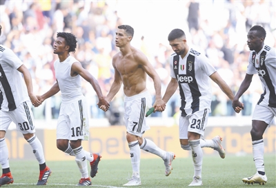 9月16日,尤文图斯队球员克·罗纳尔多(中)赛后与队友庆祝胜利。