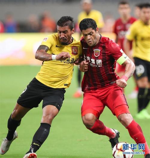 9月18日,上海上港队球员胡尔克(右)与广州恒大淘宝队球员保利尼奥在比赛中拼抢。 当日,在2018中超联赛第13轮一