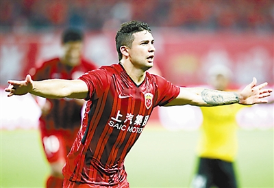 上海上港队球员埃尔克森庆祝进球。 新华社记者 丁汀 摄